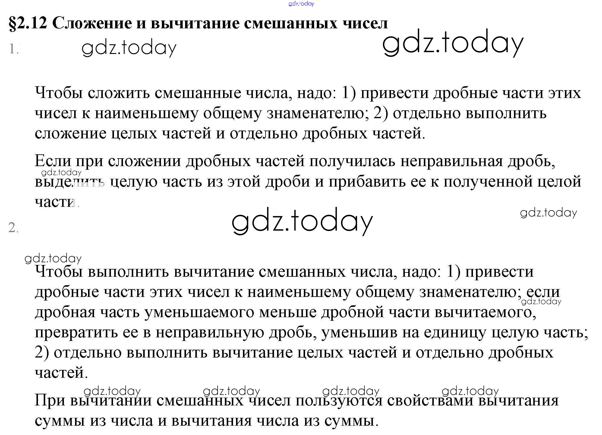 На страницах сайта gdz.today вы найдете учебный и вспомогательный материал, направленный на улучшения знаний школьной программы. ГДЗ - онлайн мир знаний Вопросы к параграфу §2. Сложение и вычитание дробей с разными знаменателями 2.12 Учебнику по Математике для 6 класса Виленкин, Жохов Мнемозина 2014