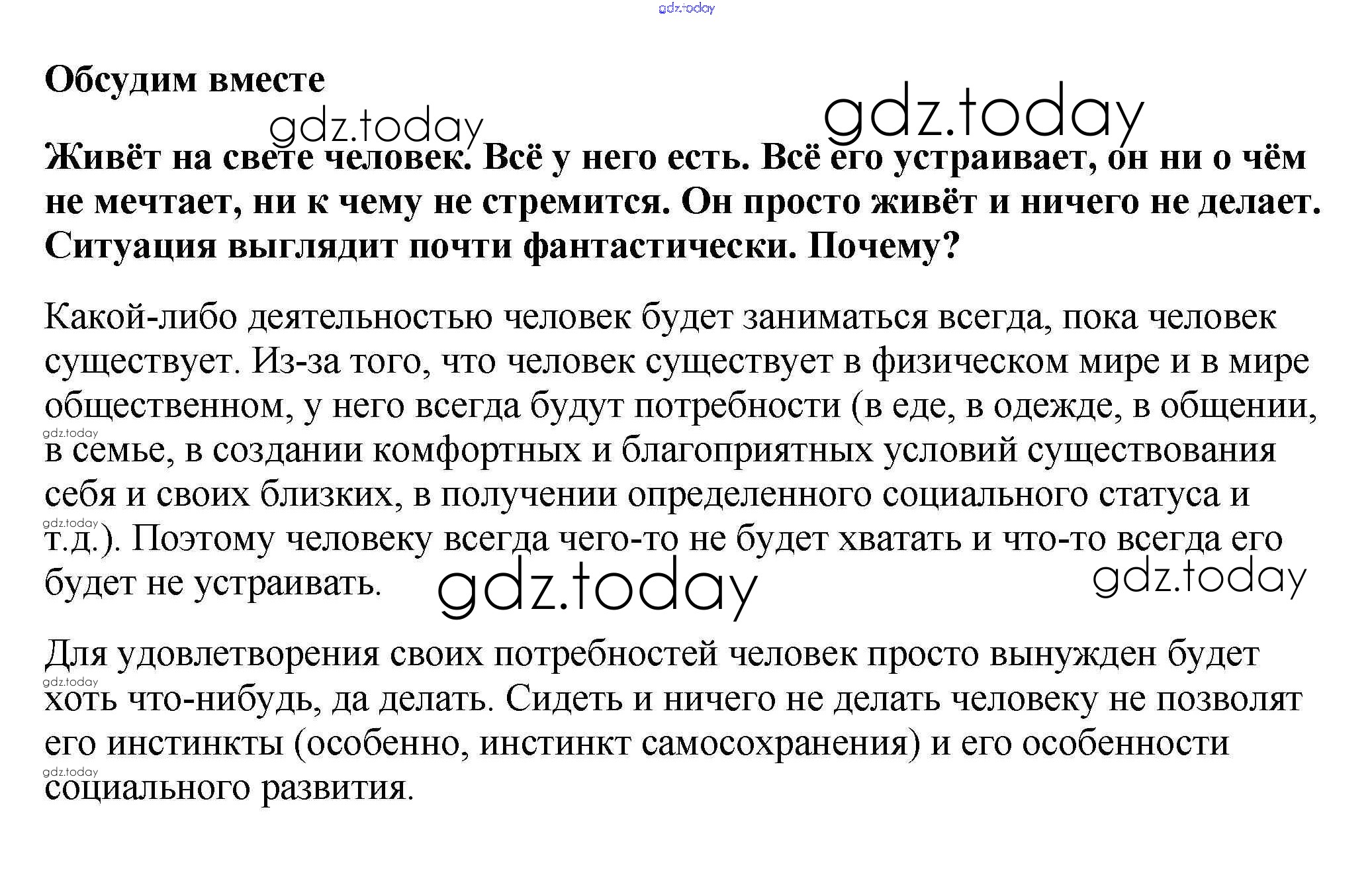 На страницах сайта gdz.today вы найдете учебный и вспомогательный материал, направленный на улучшения знаний школьной программы. ГДЗ - онлайн мир знаний Обсудим вместе §4. Потребности и способности человека 1 Учебнику по Обществознанию для 6 класса Боголюбов, Виноградова Просвещение, Просвещение Академический школьный учебник 2016, 2020
