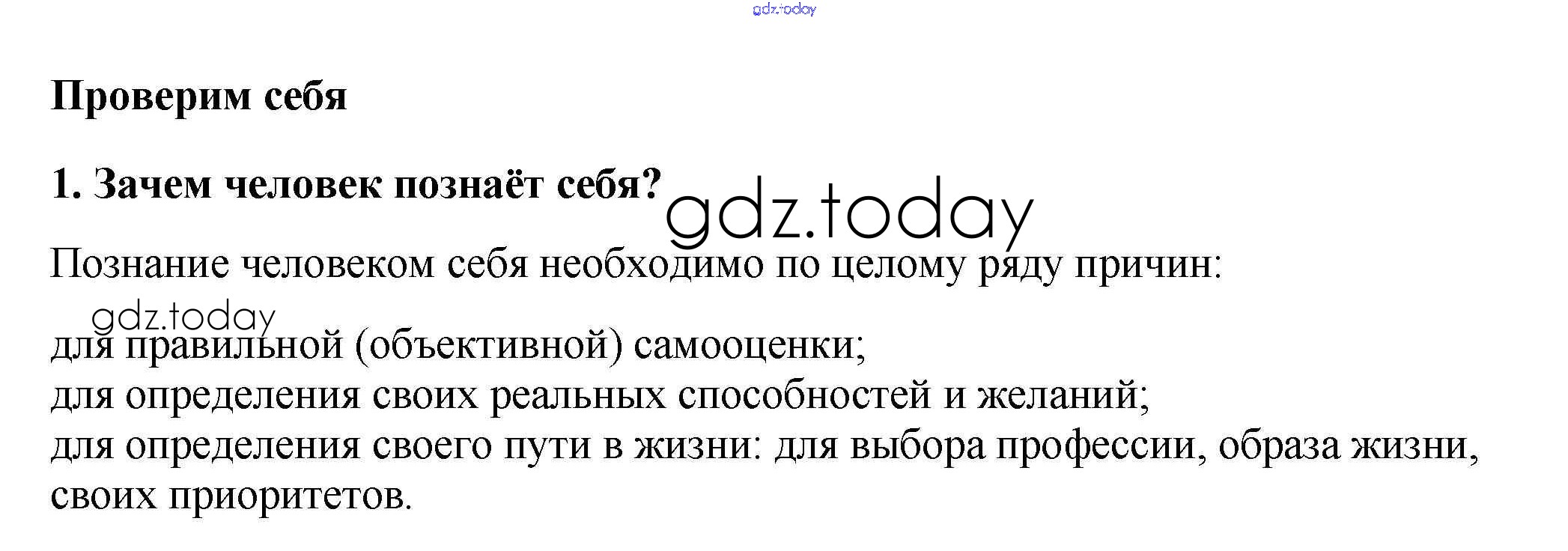 На страницах сайта gdz.today вы найдете учебный и вспомогательный материал, направленный на улучшения знаний школьной программы. ГДЗ - онлайн мир знаний Проверим себя §10. Познание человеком мира и себя 1 Учебнику по Обществознанию для 6 класса Боголюбов, Виноградова Просвещение, Просвещение Академический школьный учебник 2016, 2020