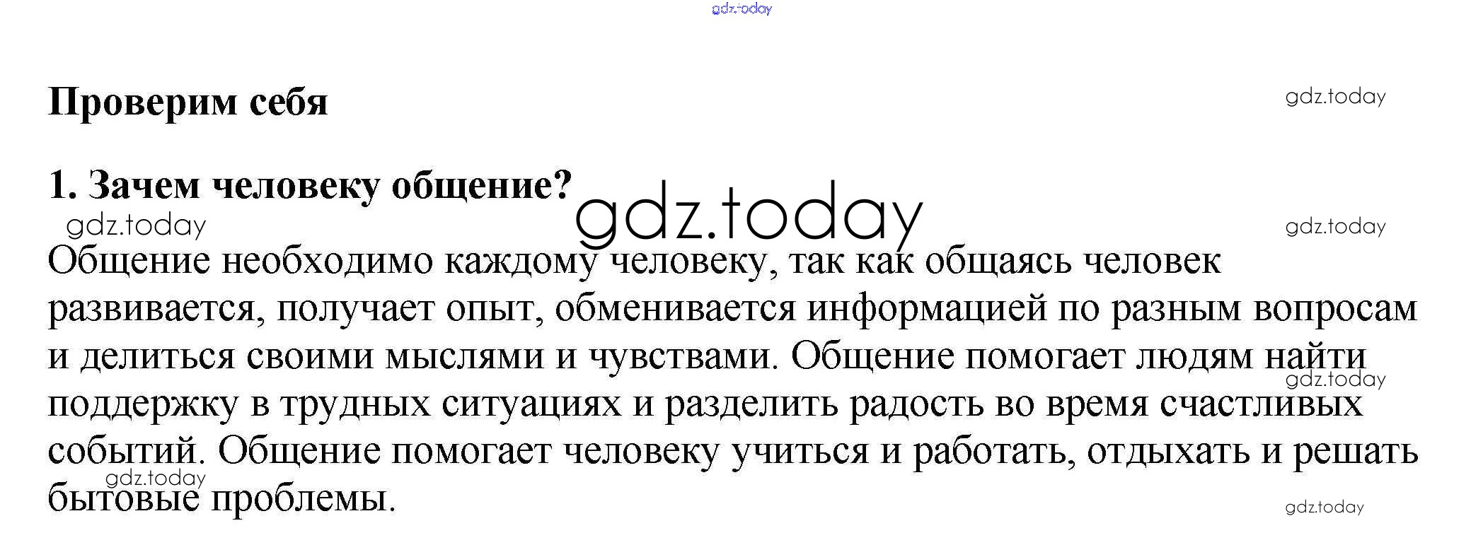 На страницах сайта gdz.today вы найдете учебный и вспомогательный материал, направленный на улучшения знаний школьной программы. ГДЗ - онлайн мир знаний Проверим себя §12. Общение 1 Учебнику по Обществознанию для 6 класса Боголюбов, Виноградова Просвещение, Просвещение Академический школьный учебник 2016, 2020