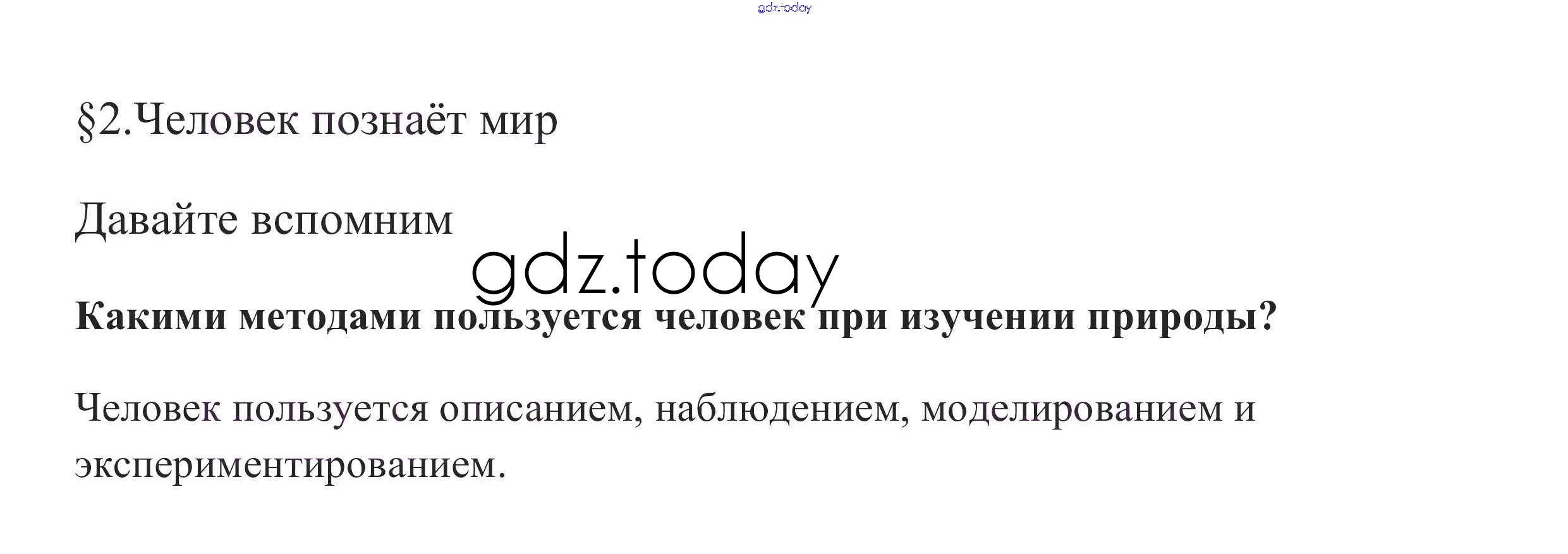 На страницах сайта gdz.today вы найдете учебный и вспомогательный материал, направленный на улучшения знаний школьной программы. ГДЗ - онлайн мир знаний Вспомним §2. Человек познает мир 1 Учебнику по Обществознанию для 6 класса Боголюбов, Виноградова Просвещение, Просвещение Академический школьный учебник 2016, 2020