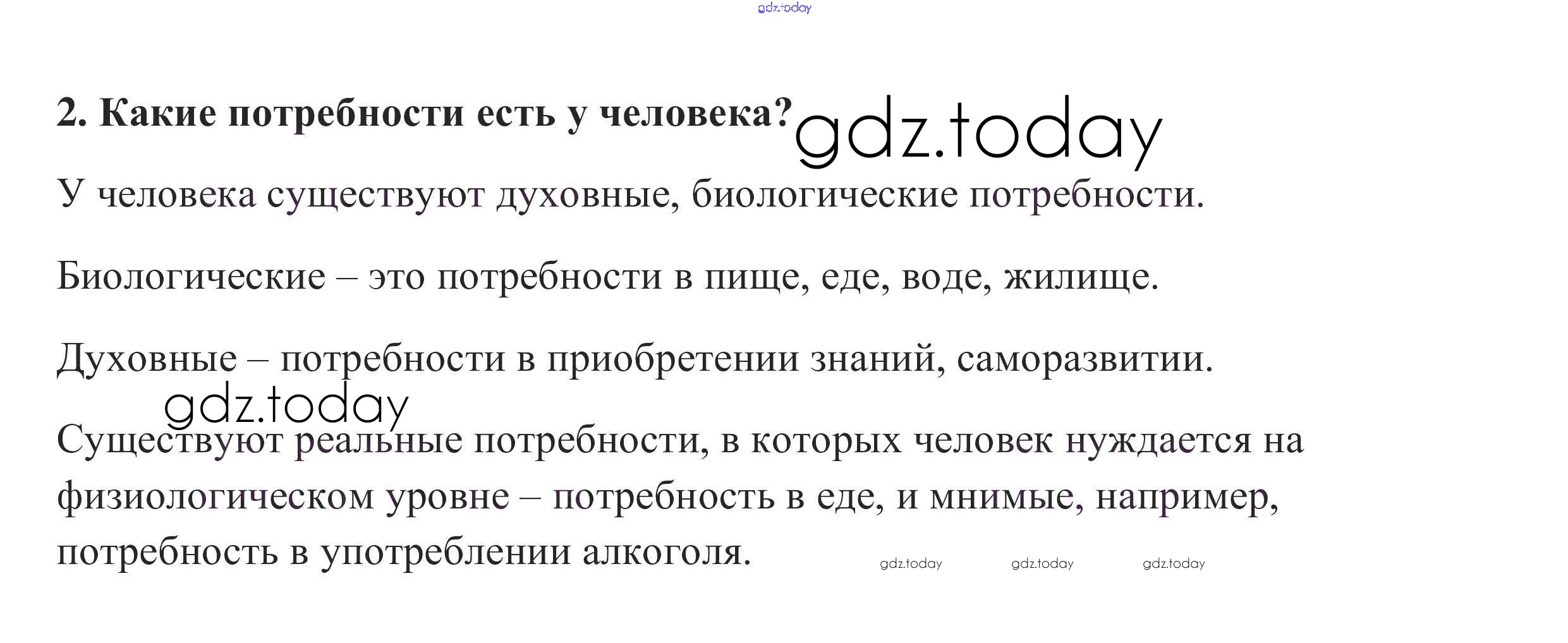 На страницах сайта gdz.today вы найдете учебный и вспомогательный материал, направленный на улучшения знаний школьной программы. ГДЗ - онлайн мир знаний Проверим себя §4. Потребности человека 2 Учебнику по Обществознанию для 6 класса Боголюбов, Виноградова Просвещение, Просвещение Академический школьный учебник 2016, 2020