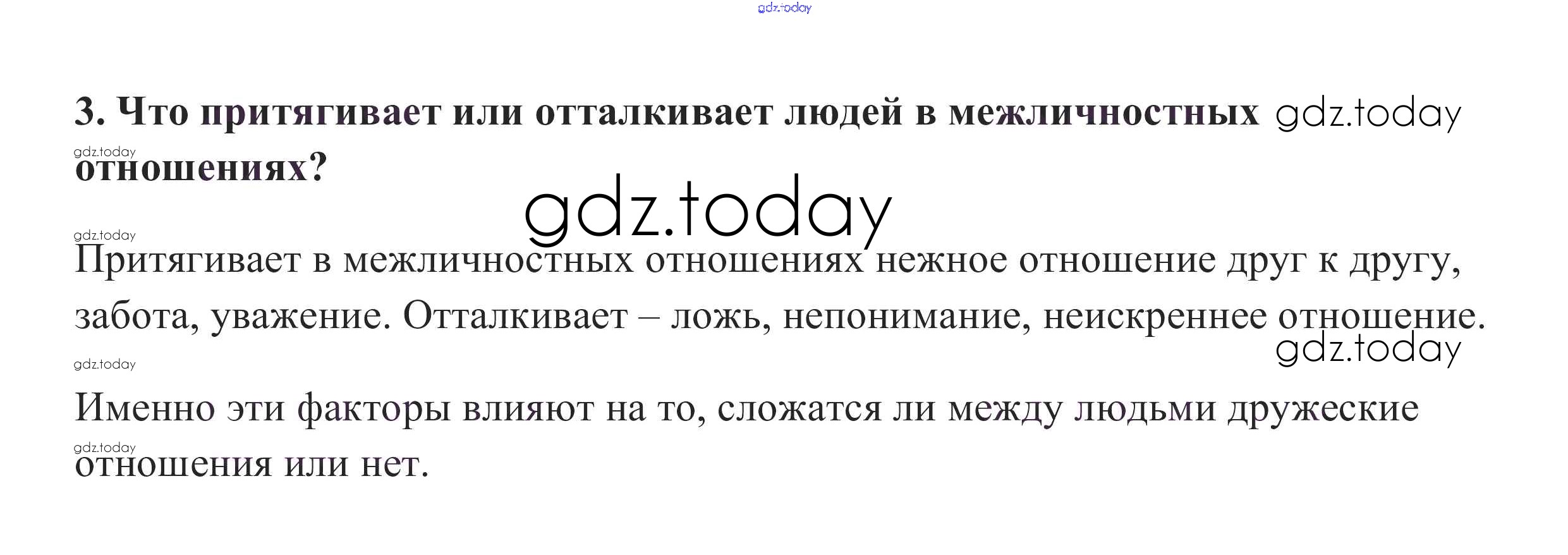 На страницах сайта gdz.today вы найдете учебный и вспомогательный материал, направленный на улучшения знаний школьной программы. ГДЗ - онлайн мир знаний Проверим себя §6. Межличностные отношения 3 Учебнику по Обществознанию для 6 класса Боголюбов, Виноградова Просвещение, Просвещение Академический школьный учебник 2016, 2020