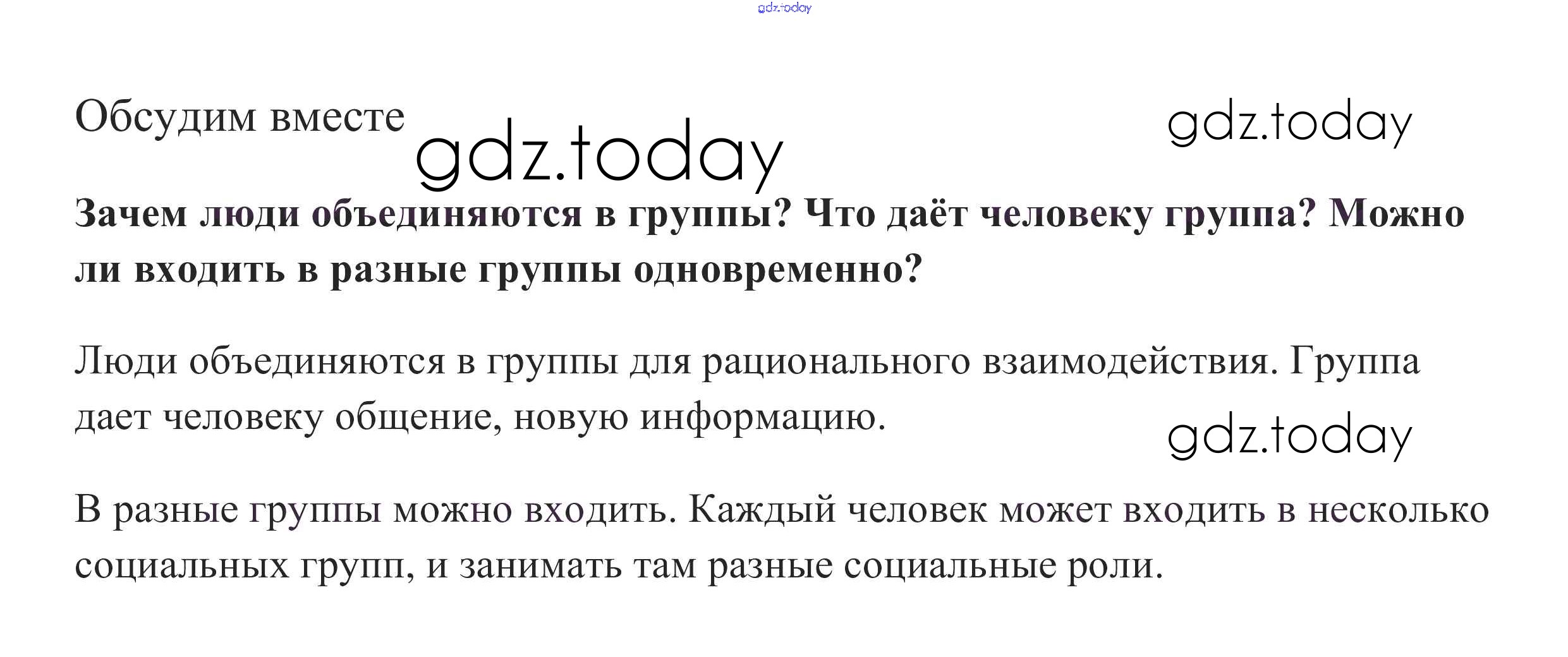 На страницах сайта gdz.today вы найдете учебный и вспомогательный материал, направленный на улучшения знаний школьной программы. ГДЗ - онлайн мир знаний Обсудим вместе §7. Человек в группе 1 Учебнику по Обществознанию для 6 класса Боголюбов, Виноградова Просвещение, Просвещение Академический школьный учебник 2016, 2020