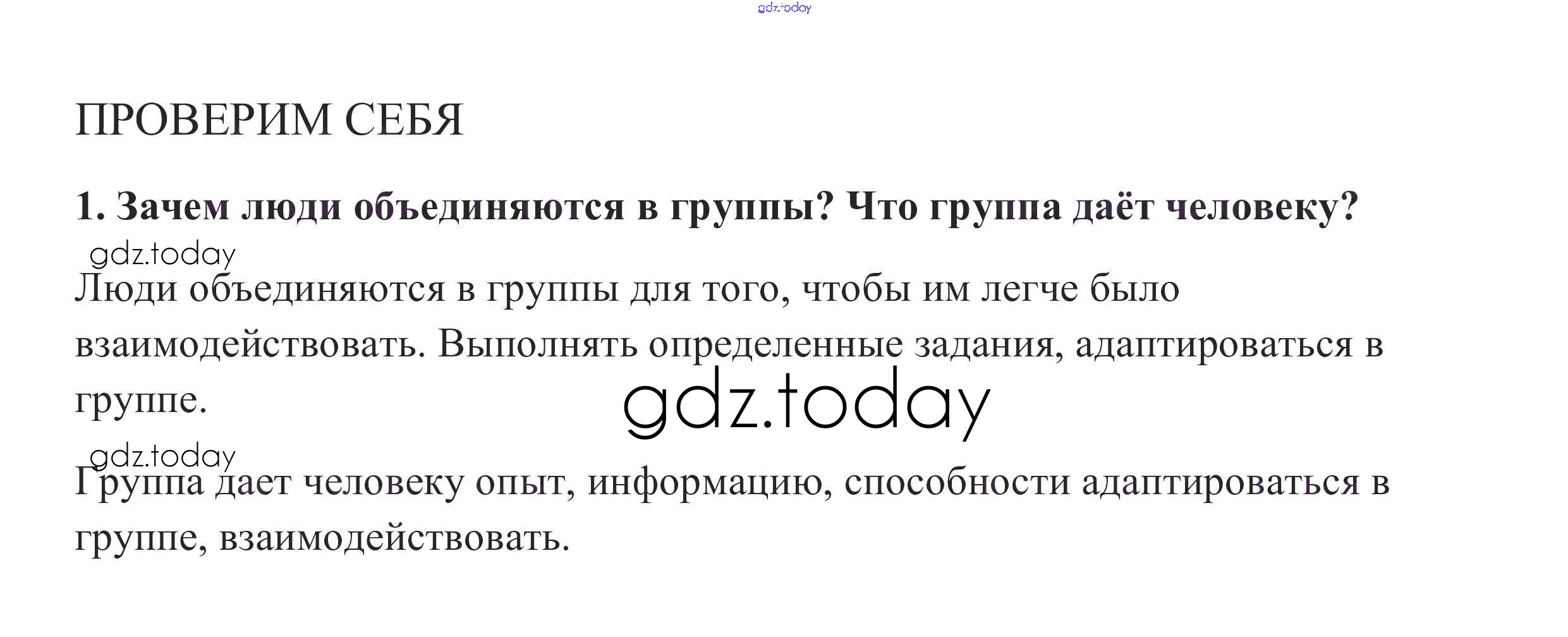 На страницах сайта gdz.today вы найдете учебный и вспомогательный материал, направленный на улучшения знаний школьной программы. ГДЗ - онлайн мир знаний Проверим себя §7. Человек в группе 1 Учебнику по Обществознанию для 6 класса Боголюбов, Виноградова Просвещение, Просвещение Академический школьный учебник 2016, 2020
