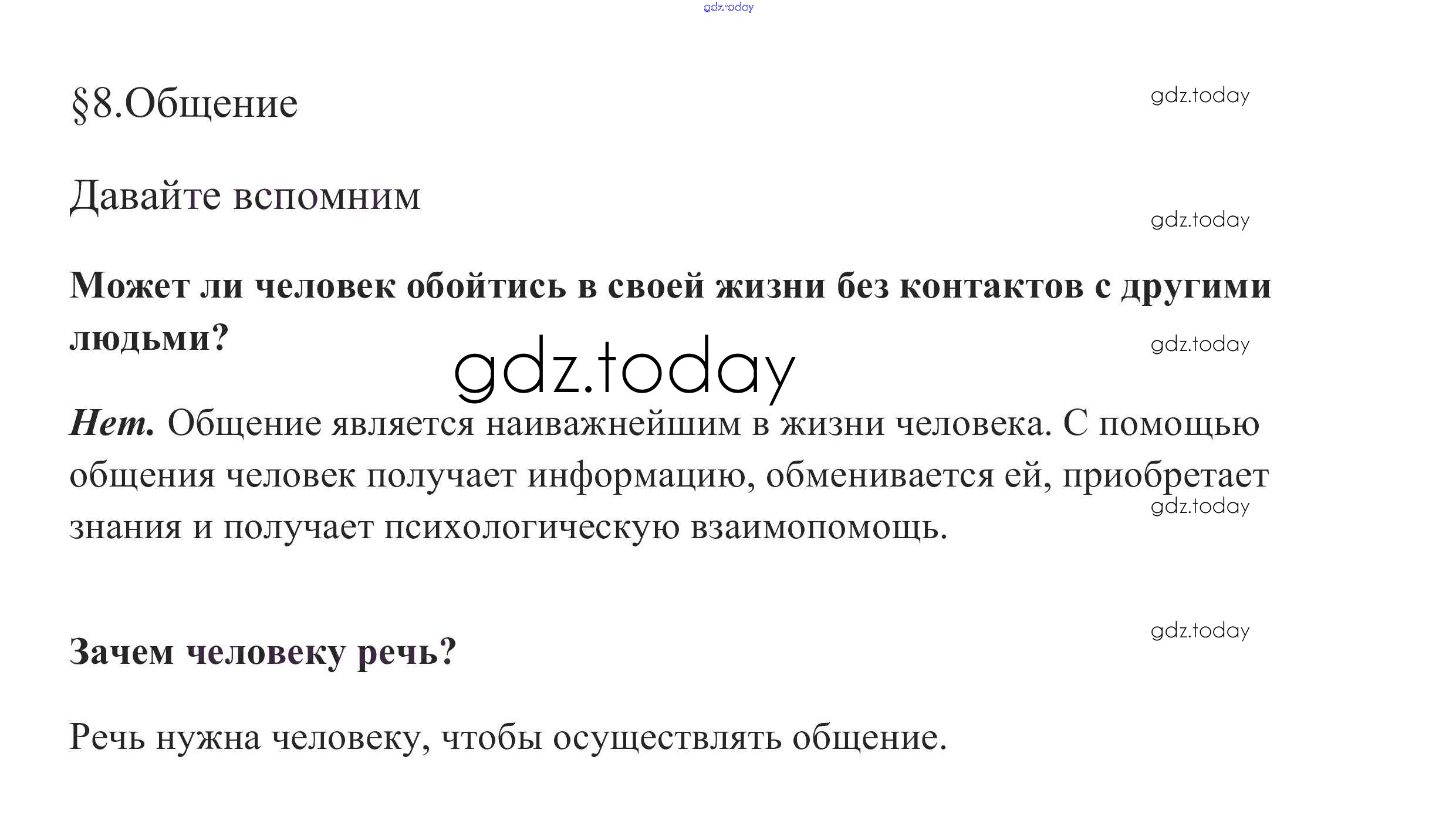 На страницах сайта gdz.today вы найдете учебный и вспомогательный материал, направленный на улучшения знаний школьной программы. ГДЗ - онлайн мир знаний Вспомним §8. Общение 1 Учебнику по Обществознанию для 6 класса Боголюбов, Виноградова Просвещение, Просвещение Академический школьный учебник 2016, 2020