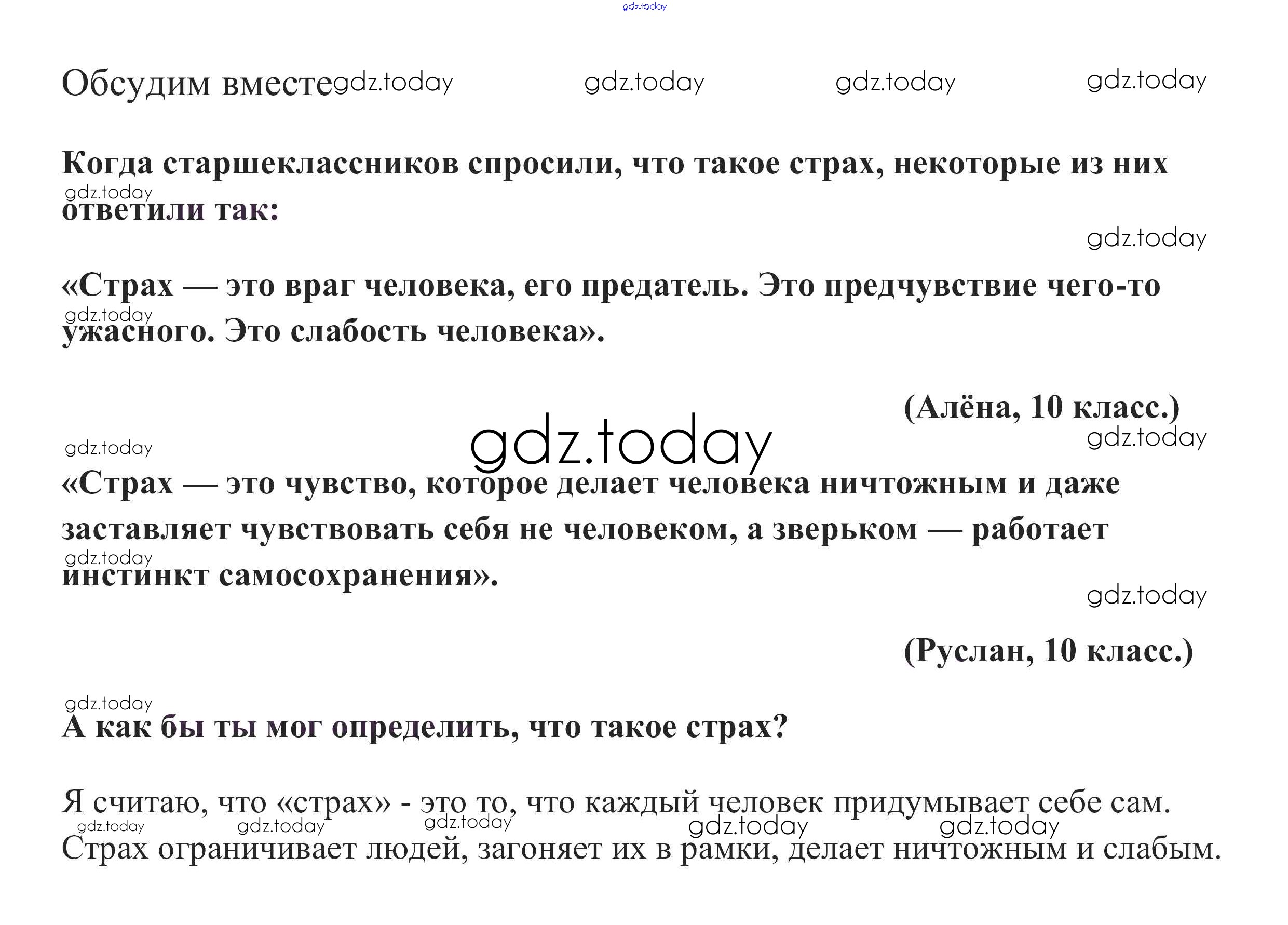 На страницах сайта gdz.today вы найдете учебный и вспомогательный материал, направленный на улучшения знаний школьной программы. ГДЗ - онлайн мир знаний Обсудим вместе §11. Будь смелым 1 Учебнику по Обществознанию для 6 класса Боголюбов, Виноградова Просвещение, Просвещение Академический школьный учебник 2016, 2020