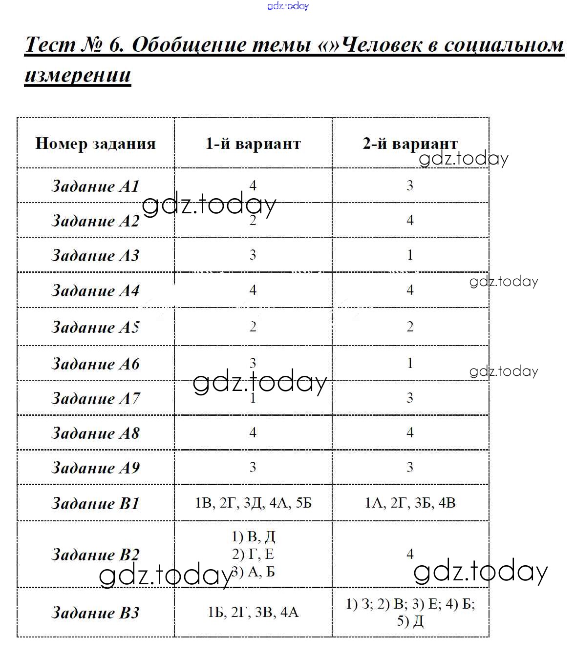 На страницах сайта gdz.today вы найдете учебный и вспомогательный материал, направленный на улучшения знаний школьной программы. ГДЗ - онлайн мир знаний Решение к тестам Тест №6. Обобщение темы - Человек в социальном измерении Контрольно-измерительным материалам (КИМ) по Обществознанию для 6 класса Поздеева ВАКО 2017