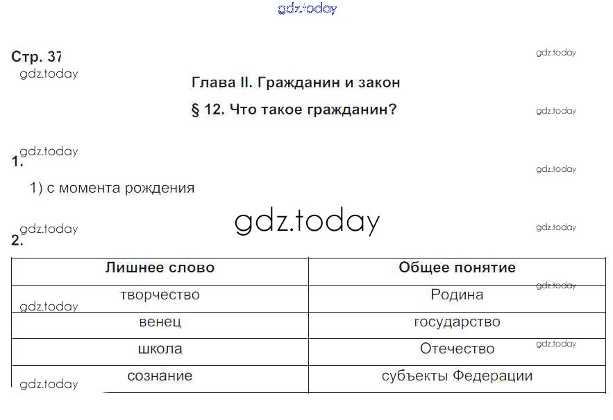 На страницах сайта gdz.today вы найдете учебный и вспомогательный материал, направленный на улучшения знаний школьной программы. ГДЗ - онлайн мир знаний Решение к главе 2. Гражданин и закон стр. 37 Рабочей тетради по Обществознанию для 6 класса Федорова Дрофа Вертикаль 2017