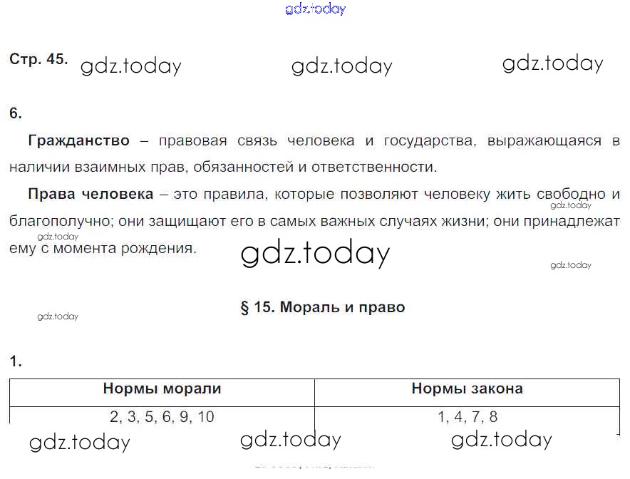 На страницах сайта gdz.today вы найдете учебный и вспомогательный материал, направленный на улучшения знаний школьной программы. ГДЗ - онлайн мир знаний Решение к главе 2. Гражданин и закон стр. 45 Рабочей тетради по Обществознанию для 6 класса Федорова Дрофа Вертикаль 2017