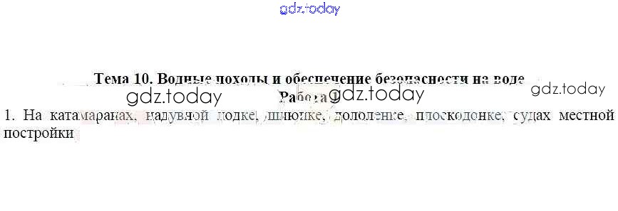 На страницах сайта gdz.today вы найдете учебный и вспомогательный материал, направленный на улучшения знаний школьной программы. ГДЗ - онлайн мир знаний Работа 1 Решение к теме 10. Водные походы и обеспечение безопасности на воде 1 Рабочей тетради по ОБЖ для 6 класса Демидов Лицей 2016