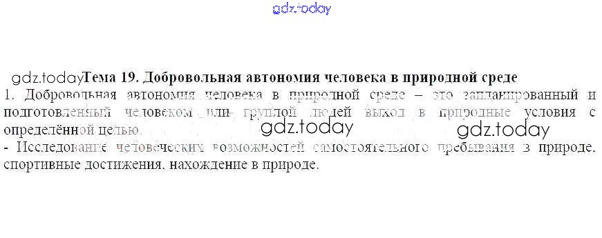 На страницах сайта gdz.today вы найдете учебный и вспомогательный материал, направленный на улучшения знаний школьной программы. ГДЗ - онлайн мир знаний Решение к теме 19. Добровольная автономия человека в природной среде 1 Рабочей тетради по ОБЖ для 6 класса Демидов Лицей 2016