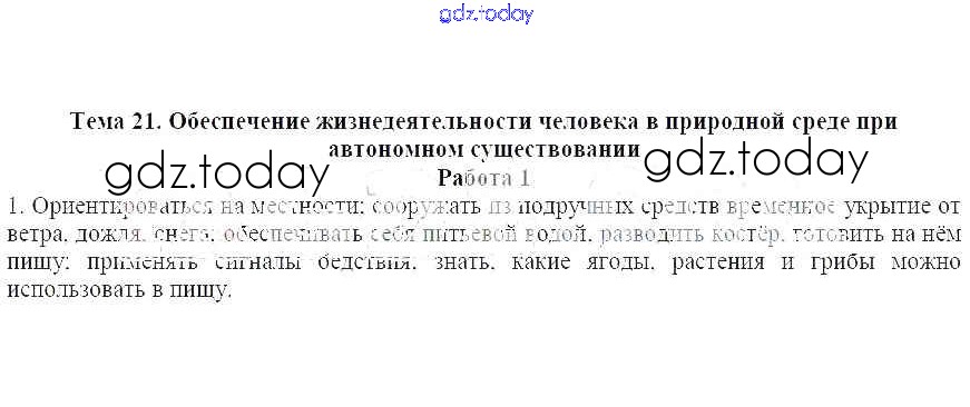 На страницах сайта gdz.today вы найдете учебный и вспомогательный материал, направленный на улучшения знаний школьной программы. ГДЗ - онлайн мир знаний Работа 1 Решение к теме 21. Обеспечение жизнедеятельности человека в природной среде при автономном существовании 1 Рабочей тетради по ОБЖ для 6 класса Демидов Лицей 2016