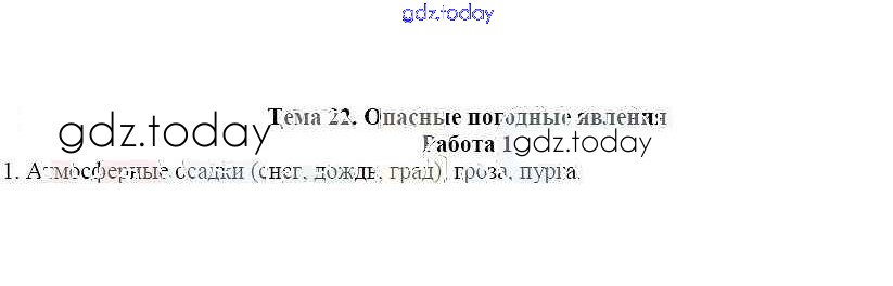 На страницах сайта gdz.today вы найдете учебный и вспомогательный материал, направленный на улучшения знаний школьной программы. ГДЗ - онлайн мир знаний Работа 1 Решение к теме 22. Опасные погодные явления 1 Рабочей тетради по ОБЖ для 6 класса Демидов Лицей 2016