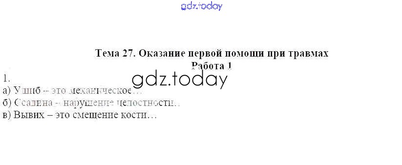 На страницах сайта gdz.today вы найдете учебный и вспомогательный материал, направленный на улучшения знаний школьной программы. ГДЗ - онлайн мир знаний Работа 1 Решение к теме 27. Оказание первой помощи при травмах 1 Рабочей тетради по ОБЖ для 6 класса Демидов Лицей 2016