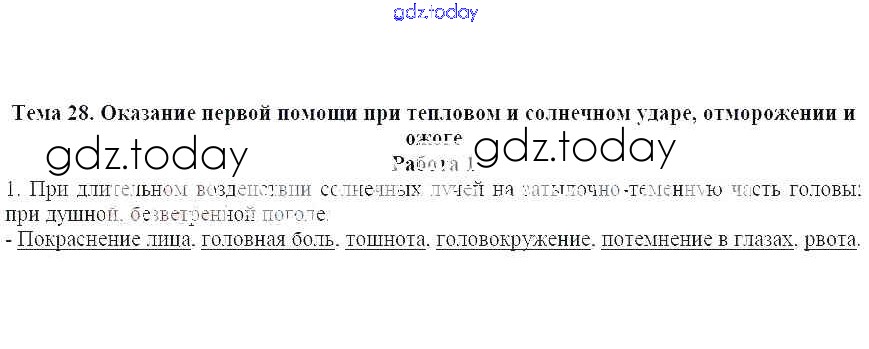 На страницах сайта gdz.today вы найдете учебный и вспомогательный материал, направленный на улучшения знаний школьной программы. ГДЗ - онлайн мир знаний Работа 1 Решение к теме 28. Оказание первой помощи при тепловом и солнечном ударе, отморожении и ожоге 1 Рабочей тетради по ОБЖ для 6 класса Демидов Лицей 2016