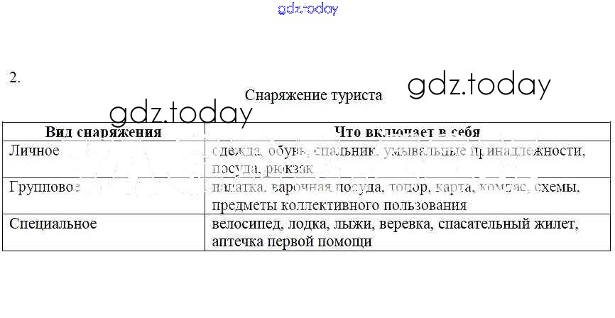 На страницах сайта gdz.today вы найдете учебный и вспомогательный материал, направленный на улучшения знаний школьной программы. ГДЗ - онлайн мир знаний Решение к теме 4. Определение необходимого снаряжения для похода 2 Рабочей тетради по ОБЖ для 6 класса Егорова Лицей 2012
