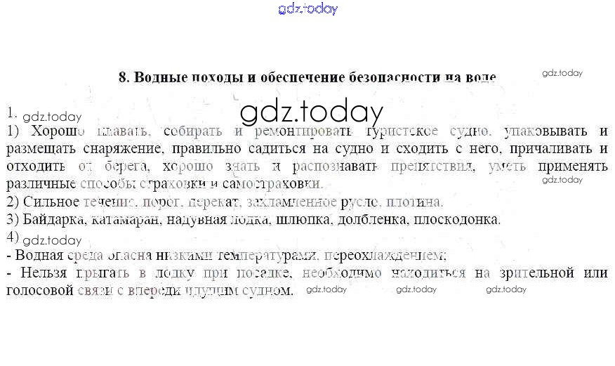 На страницах сайта gdz.today вы найдете учебный и вспомогательный материал, направленный на улучшения знаний школьной программы. ГДЗ - онлайн мир знаний Решение к теме 8. Водные походы и обеспечение безопасности на воде 1 Рабочей тетради по ОБЖ для 6 класса Егорова Лицей 2012