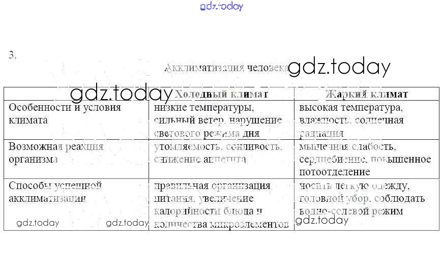 На страницах сайта gdz.today вы найдете учебный и вспомогательный материал, направленный на улучшения знаний школьной программы. ГДЗ - онлайн мир знаний Решение к теме 11. Акклиматизация человека в различных климатических условиях 3 Рабочей тетради по ОБЖ для 6 класса Егорова Лицей 2012