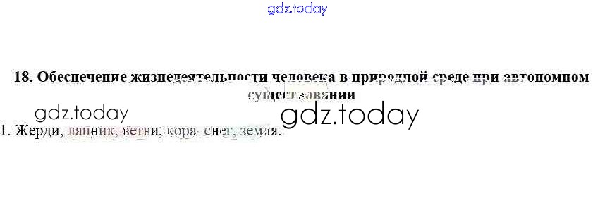 На страницах сайта gdz.today вы найдете учебный и вспомогательный материал, направленный на улучшения знаний школьной программы. ГДЗ - онлайн мир знаний Решение к теме 18. Обеспечение жизнедеятельности человека в природной среде при автономном существовании 1 Рабочей тетради по ОБЖ для 6 класса Егорова Лицей 2012