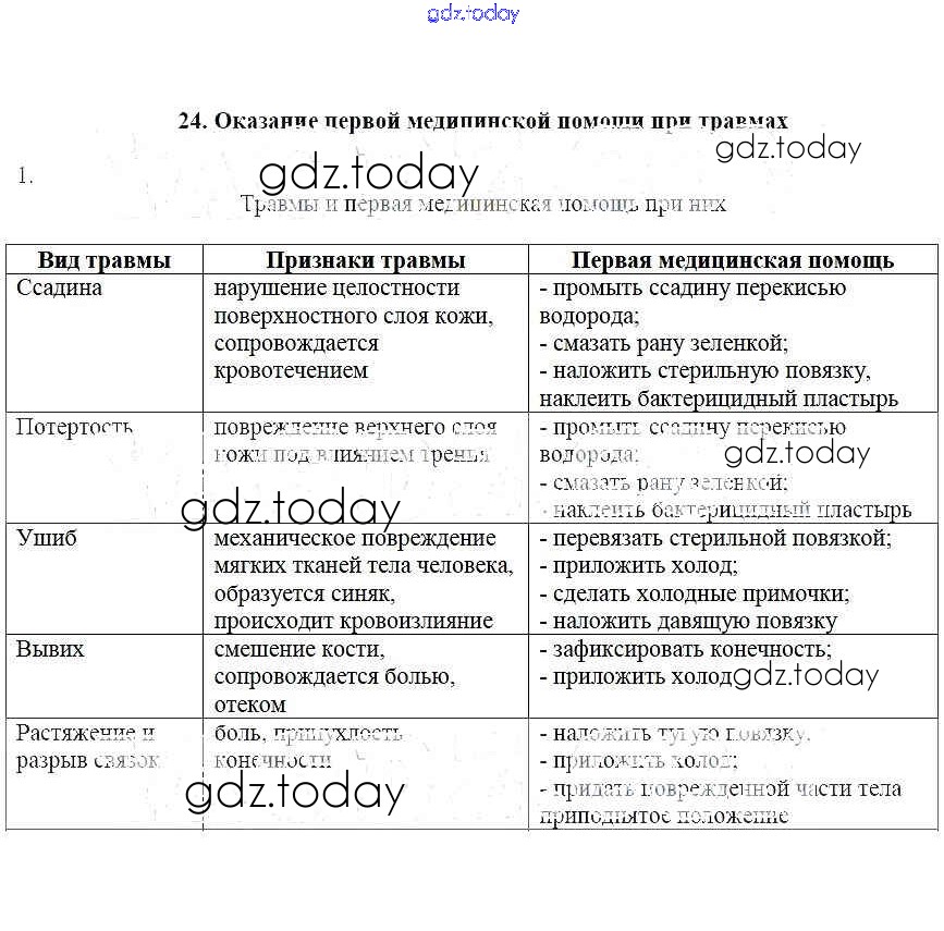 На страницах сайта gdz.today вы найдете учебный и вспомогательный материал, направленный на улучшения знаний школьной программы. ГДЗ - онлайн мир знаний Решение к теме 24. Оказание первой медицинской помощи при травмах 1 Рабочей тетради по ОБЖ для 6 класса Егорова Лицей 2012
