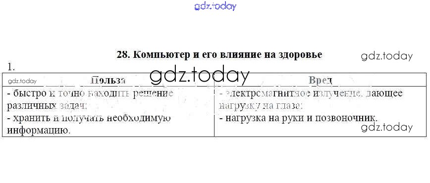На страницах сайта gdz.today вы найдете учебный и вспомогательный материал, направленный на улучшения знаний школьной программы. ГДЗ - онлайн мир знаний Решение к теме 28. Компьютер и его влияние на здоровье 1 Рабочей тетради по ОБЖ для 6 класса Егорова Лицей 2012