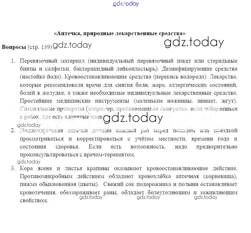 На страницах сайта gdz.today вы найдете учебный и вспомогательный материал, направленный на улучшения знаний школьной программы. ГДЗ - онлайн мир знаний Страницы (решение) 139 Учебнику по ОБЖ для 6 класса Фролов, Шолох Дрофа 2017