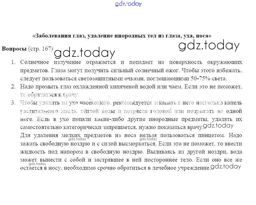 На страницах сайта gdz.today вы найдете учебный и вспомогательный материал, направленный на улучшения знаний школьной программы. ГДЗ - онлайн мир знаний Страницы (решение) 167 Учебнику по ОБЖ для 6 класса Фролов, Шолох Дрофа 2017