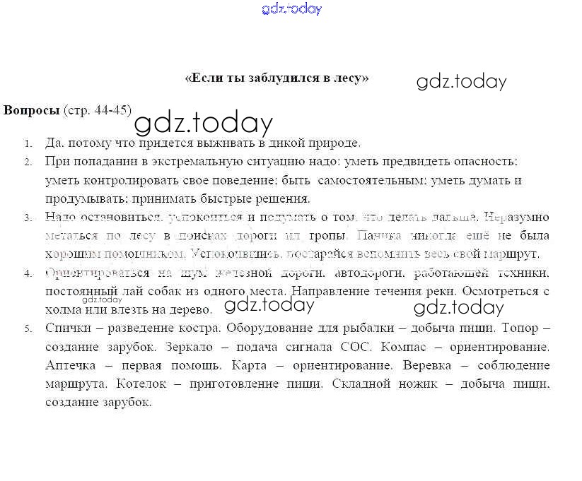 На страницах сайта gdz.today вы найдете учебный и вспомогательный материал, направленный на улучшения знаний школьной программы. ГДЗ - онлайн мир знаний Страницы (решение) 44-45 Учебнику по ОБЖ для 6 класса Фролов, Шолох Дрофа 2017