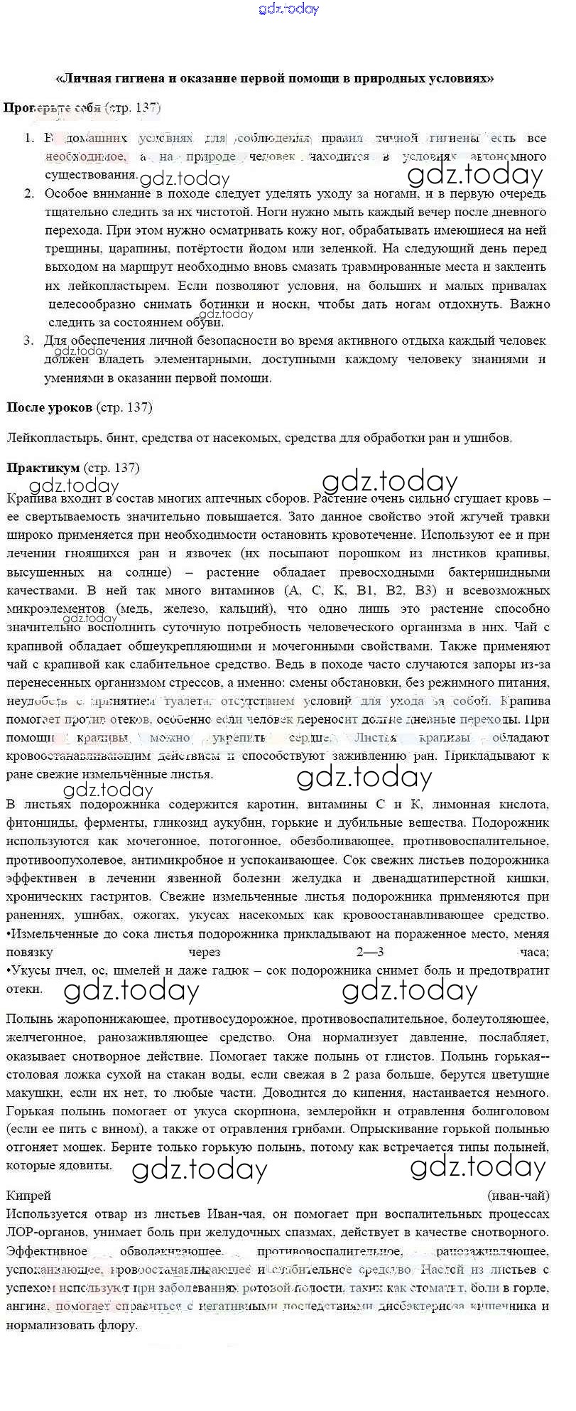 На страницах сайта gdz.today вы найдете учебный и вспомогательный материал, направленный на улучшения знаний школьной программы. ГДЗ - онлайн мир знаний Страницы (решение) 137 Учебнику по ОБЖ для 6 класса Смирнов, Хренников Просвещение 2018