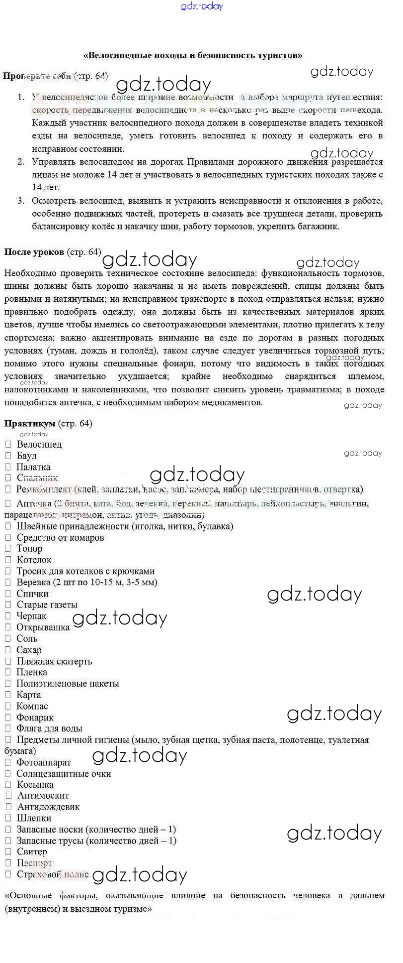 На страницах сайта gdz.today вы найдете учебный и вспомогательный материал, направленный на улучшения знаний школьной программы. ГДЗ - онлайн мир знаний Страницы (решение) 64 Учебнику по ОБЖ для 6 класса Смирнов, Хренников Просвещение 2018