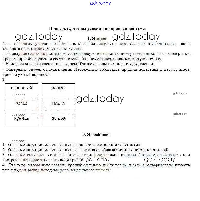 На страницах сайта gdz.today вы найдете учебный и вспомогательный материал, направленный на улучшения знаний школьной программы. ГДЗ - онлайн мир знаний Решение к главе 5 Проверьте свои знания Рабочей тетради по ОБЖ для 6 класса Смирнов, Хренников Просвещение 2016