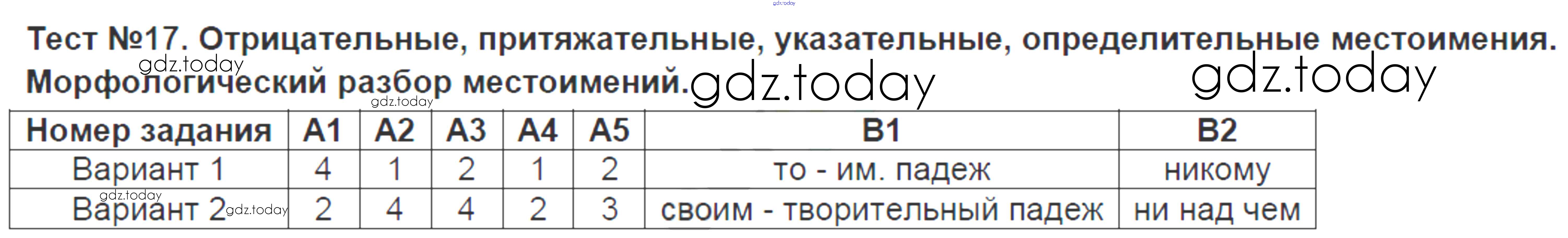 На страницах сайта gdz.today вы найдете учебный и вспомогательный материал, направленный на улучшения знаний школьной программы. ГДЗ - онлайн мир знаний Решение к тестам Тест-17. Отрицательные, притяжательные, указательные, определительные местоимения Контрольно-измерительным материалам (КИМ) по Русскому языку для 6 класса Аксенова Экзамен 2014