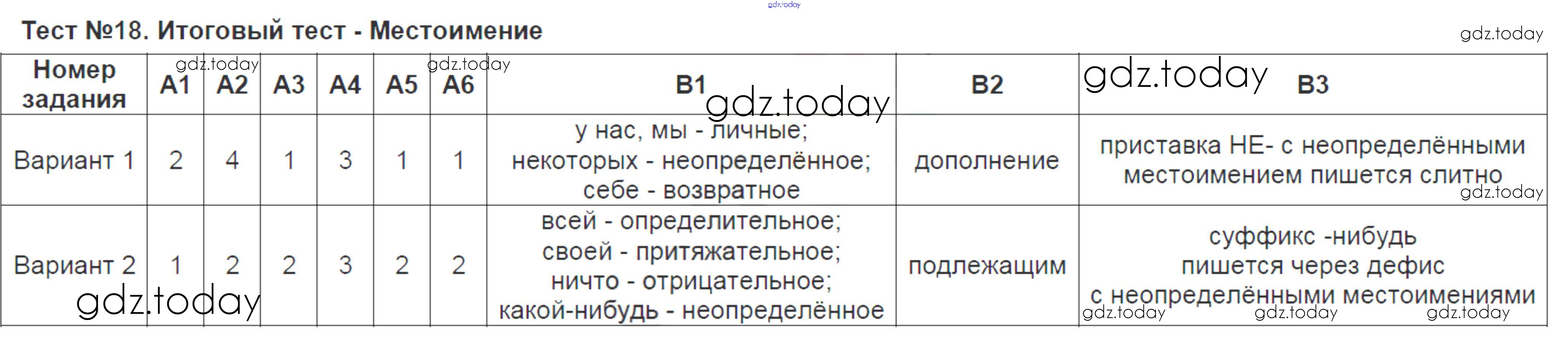 Ответы к Решение к тестам Тест-18. Итоговый тест - Местоимение Контрольно-измерительным материалам (КИМ) по Русскому языку для 6 класса Аксенова Экзамен 2014