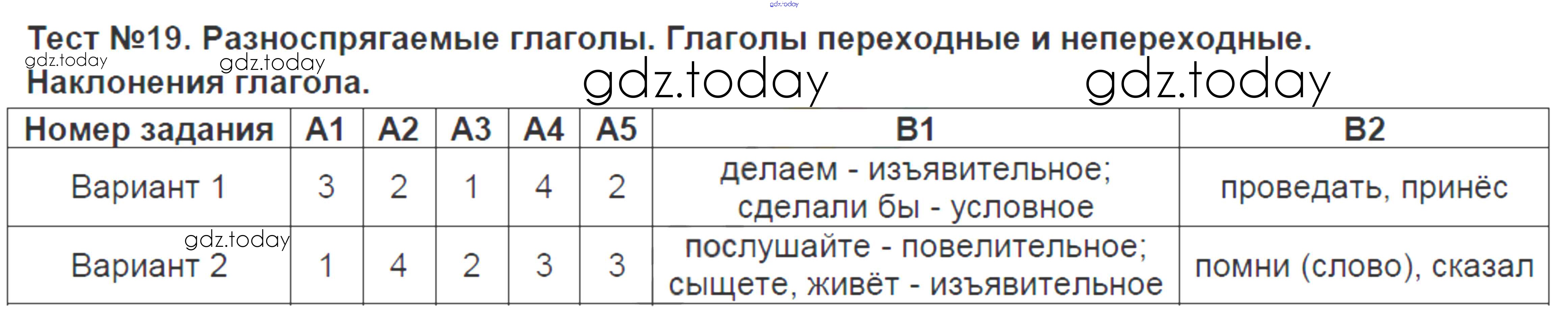 На страницах сайта gdz.today вы найдете учебный и вспомогательный материал, направленный на улучшения знаний школьной программы. ГДЗ - онлайн мир знаний Решение к тестам Тест-19. Разноспрягаемые глаголы. Глаголы переходные и непереходные Контрольно-измерительным материалам (КИМ) по Русскому языку для 6 класса Аксенова Экзамен 2014