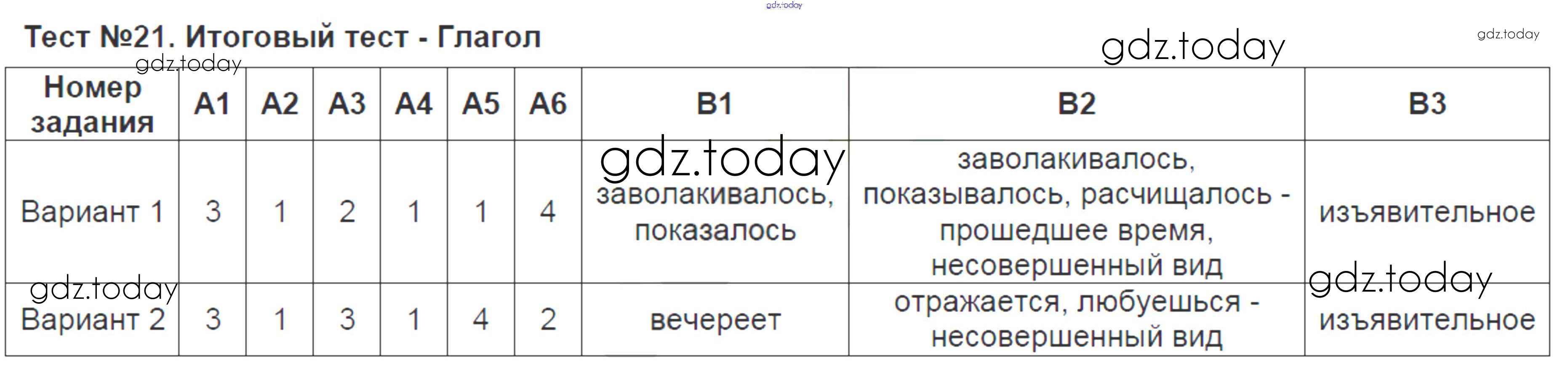 Ответы к Решение к тестам Тест-21. Итоговый тест - Глагол Контрольно-измерительным материалам (КИМ) по Русскому языку для 6 класса Аксенова Экзамен 2014