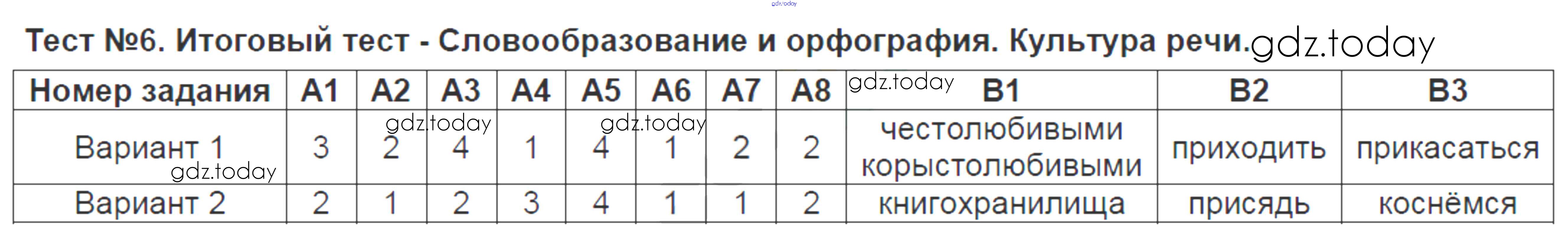 На страницах сайта gdz.today вы найдете учебный и вспомогательный материал, направленный на улучшения знаний школьной программы. ГДЗ - онлайн мир знаний Решение к тестам Тест-6. Итоговый тест - Словообразование и орфография. Культура речи Контрольно-измерительным материалам (КИМ) по Русскому языку для 6 класса Аксенова Экзамен 2014