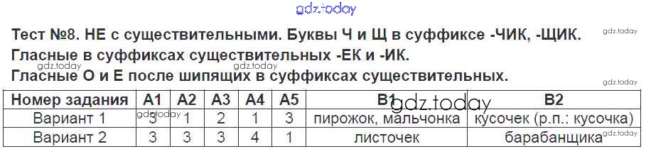 На страницах сайта gdz.today вы найдете учебный и вспомогательный материал, направленный на улучшения знаний школьной программы. ГДЗ - онлайн мир знаний Решение к тестам Тест-8. НЕ с существительными. Буквы Ч и Щ в суффиксе -ЧИК, -ЩИК Контрольно-измерительным материалам (КИМ) по Русскому языку для 6 класса Аксенова Экзамен 2014