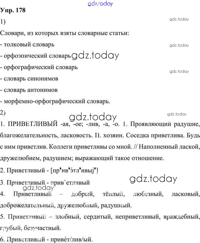На страницах сайта gdz.today вы найдете учебный и вспомогательный материал, направленный на улучшения знаний школьной программы. ГДЗ - онлайн мир знаний Решение к упражнениям 178 Учебнику по Русскому языку для 6 класса Александрова, Загоровская Просвещение 2020