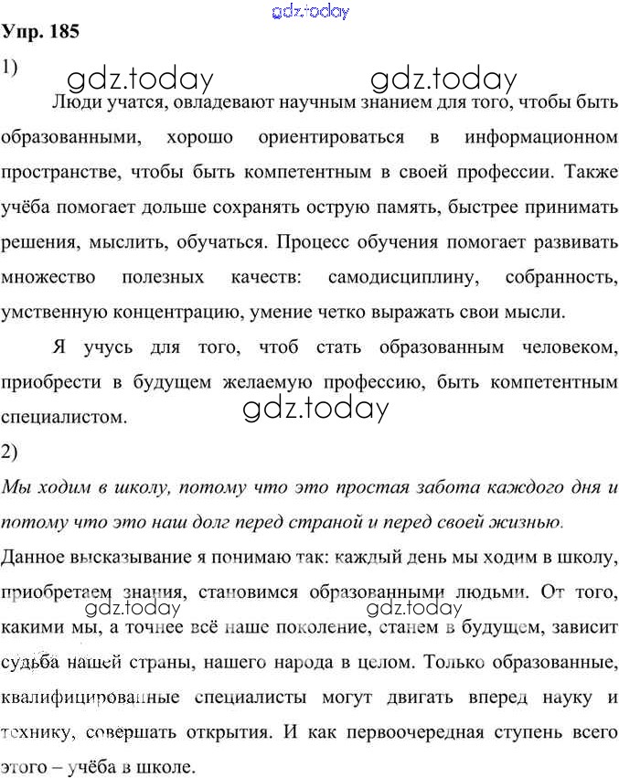 На страницах сайта gdz.today вы найдете учебный и вспомогательный материал, направленный на улучшения знаний школьной программы. ГДЗ - онлайн мир знаний Решение к упражнениям 185 Учебнику по Русскому языку для 6 класса Александрова, Загоровская Просвещение 2020