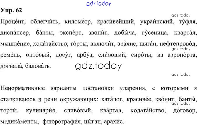 На страницах сайта gdz.today вы найдете учебный и вспомогательный материал, направленный на улучшения знаний школьной программы. ГДЗ - онлайн мир знаний Решение к упражнениям 62 Учебнику по Русскому языку для 6 класса Александрова, Загоровская Просвещение 2020