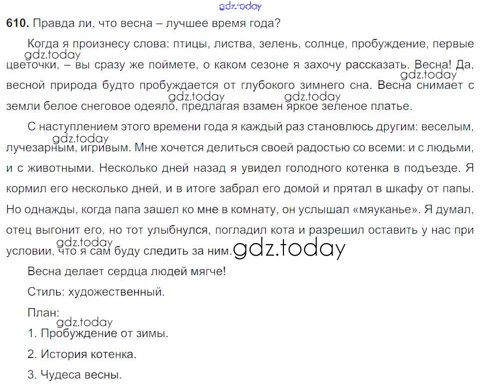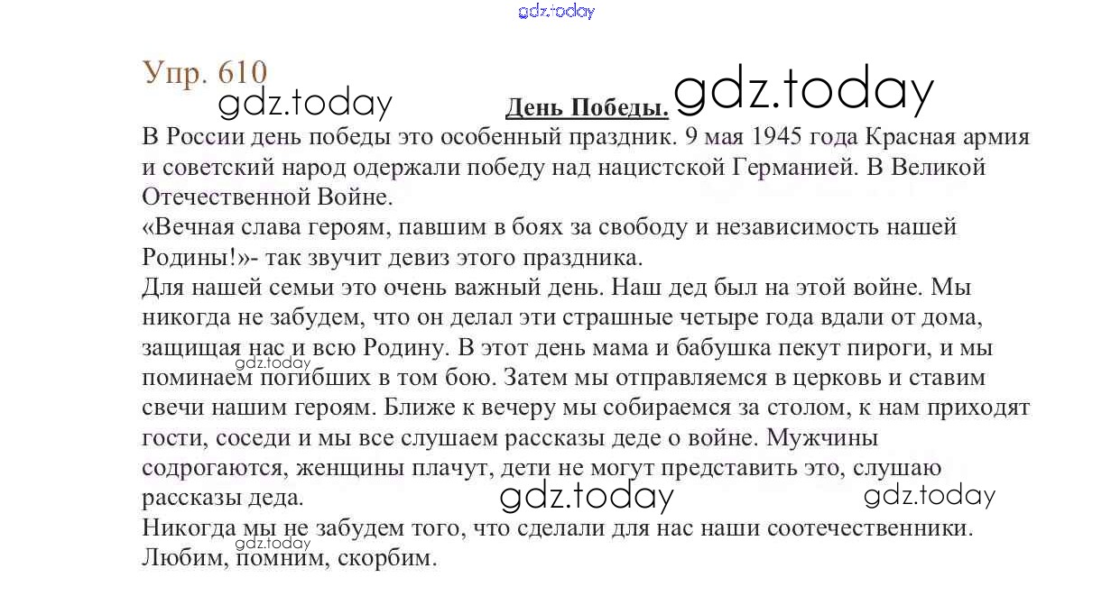 На страницах сайта gdz.today вы найдете учебный и вспомогательный материал, направленный на улучшения знаний школьной программы. ГДЗ - онлайн мир знаний Упражнения Часть 2 610 Учебнику по Русскому языку для 6 класса Баранов, Ладыженская Просвещение, Просвещение 2015, 2022