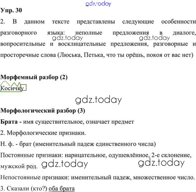 На страницах сайта gdz.today вы найдете учебный и вспомогательный материал, направленный на улучшения знаний школьной программы. ГДЗ - онлайн мир знаний Упражнения Часть 1 (решение) 30 Учебнику по Русскому языку для 6 класса Быстрова, Кибирева Русское слово Инновационная школа 2016