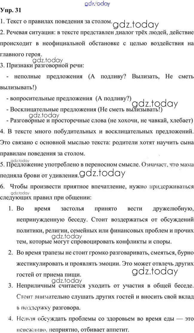 На страницах сайта gdz.today вы найдете учебный и вспомогательный материал, направленный на улучшения знаний школьной программы. ГДЗ - онлайн мир знаний Упражнения Часть 1 (решение) 31 Учебнику по Русскому языку для 6 класса Быстрова, Кибирева Русское слово Инновационная школа 2016