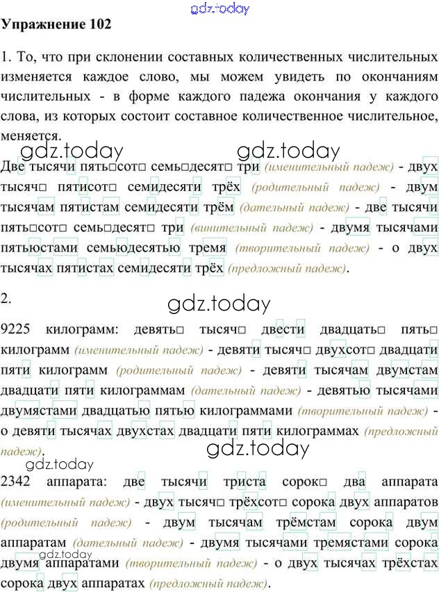 На страницах сайта gdz.today вы найдете учебный и вспомогательный материал, направленный на улучшения знаний школьной программы. ГДЗ - онлайн мир знаний Упражнения Часть 2 (решение) 102 Учебнику по Русскому языку для 6 класса Быстрова, Кибирева Русское слово Инновационная школа 2016