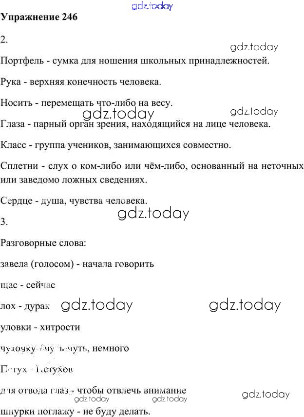 На страницах сайта gdz.today вы найдете учебный и вспомогательный материал, направленный на улучшения знаний школьной программы. ГДЗ - онлайн мир знаний Упражнения Часть 2 (решение) 246 Учебнику по Русскому языку для 6 класса Быстрова, Кибирева Русское слово Инновационная школа 2016