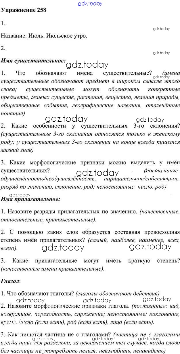 На страницах сайта gdz.today вы найдете учебный и вспомогательный материал, направленный на улучшения знаний школьной программы. ГДЗ - онлайн мир знаний Упражнения Часть 2 (решение) 258 Учебнику по Русскому языку для 6 класса Быстрова, Кибирева Русское слово Инновационная школа 2016