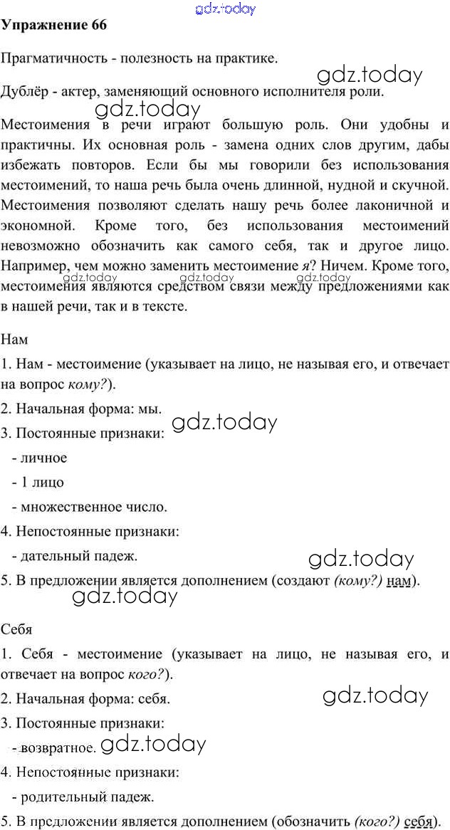 На страницах сайта gdz.today вы найдете учебный и вспомогательный материал, направленный на улучшения знаний школьной программы. ГДЗ - онлайн мир знаний Упражнения Часть 2 (решение) 66 Учебнику по Русскому языку для 6 класса Быстрова, Кибирева Русское слово Инновационная школа 2016