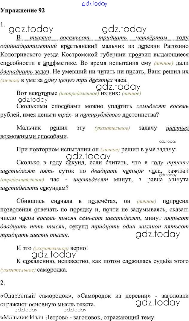 На страницах сайта gdz.today вы найдете учебный и вспомогательный материал, направленный на улучшения знаний школьной программы. ГДЗ - онлайн мир знаний Упражнения Часть 2 (решение) 92 Учебнику по Русскому языку для 6 класса Быстрова, Кибирева Русское слово Инновационная школа 2016