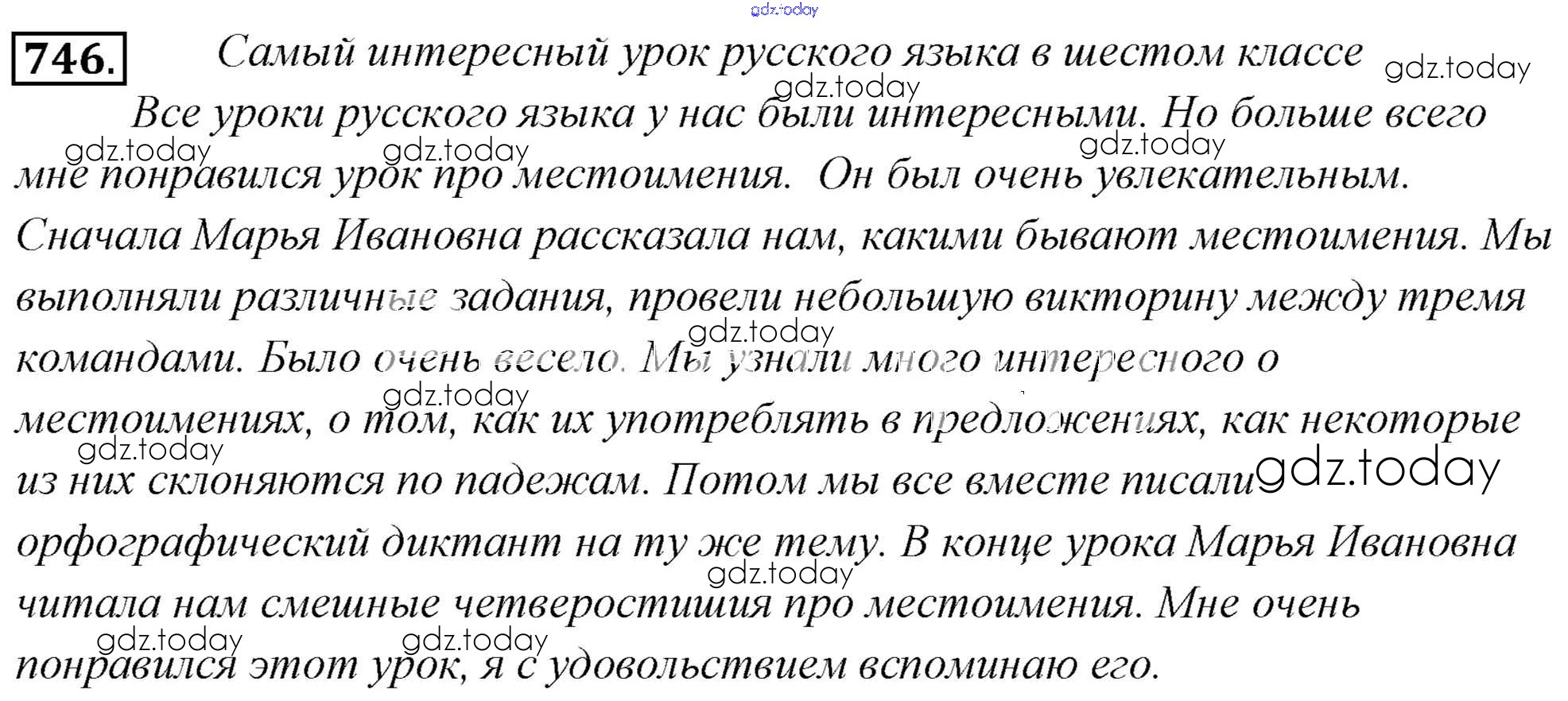 На страницах сайта gdz.today вы найдете учебный и вспомогательный материал, направленный на улучшения знаний школьной программы. ГДЗ - онлайн мир знаний Решение к упражнениям 746 Учебнику по Русскому языку для 6 класса Львова, Львов Мнемозина 2013